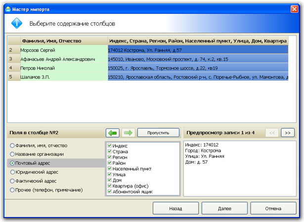 Программа "Почтовые Конверты" включает возможность импорта данных из файлов MS Excel и CSV, при этом происходит автоматический разбор адресов.