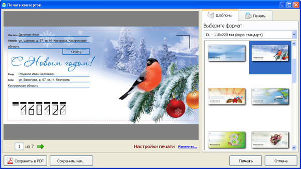 В программе можно сохранять и распечатывать как заполненные, так и пустые конверты.